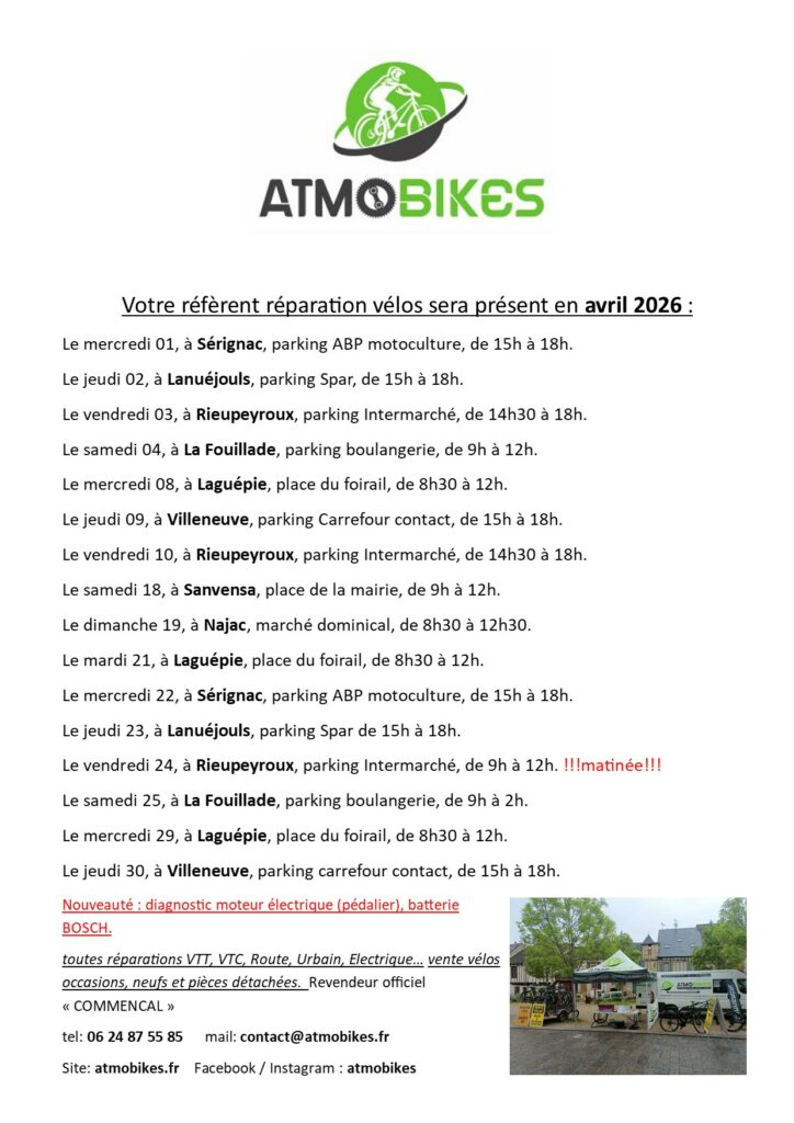 Après avoir fixé un rendez-vous sur le lieu de votre choix (domicile, lieu de travail…), ou sur les points fixes : à Laguépie (mardi), Limogne/Sérignac (mercredi), Lanuéjouls/Villeneuve (jeudi), Rieupeyroux (vendredi), La Fouillade (samedi), Najac (dimanche), j’effectue les réparations ou l’entretien sur place.